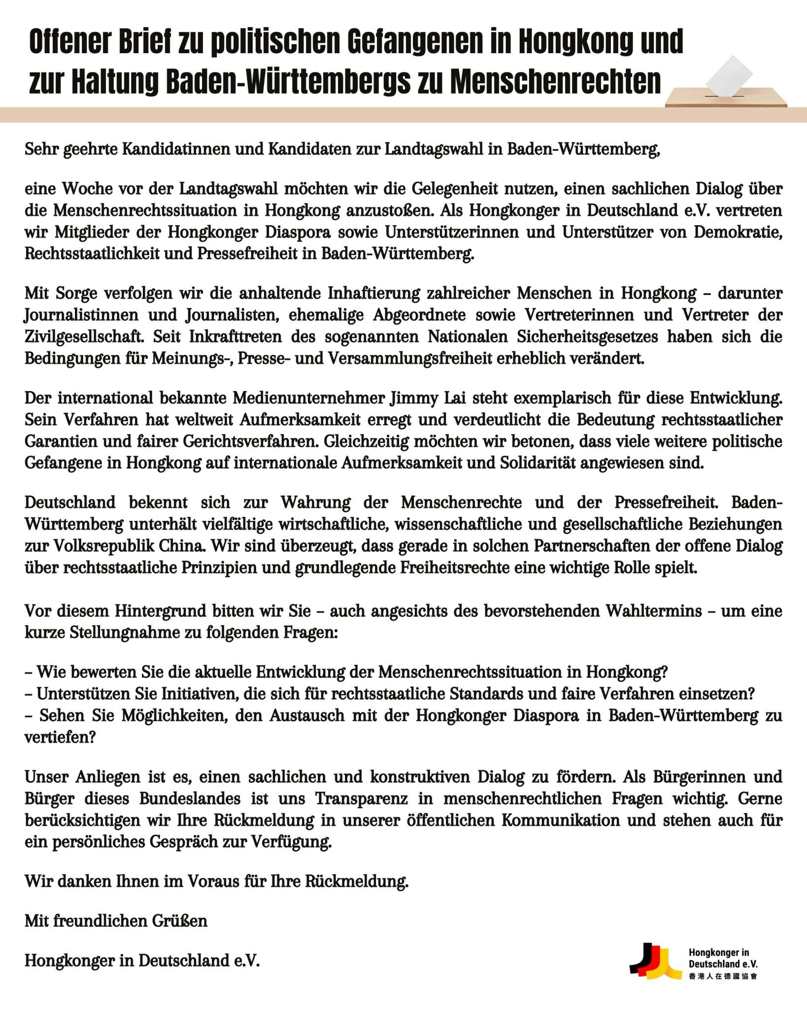 Eine Woche vor der Landtagswahl in Baden-Württemberg haben wir einen offenen Brief an die Kandidatinnen und Kandidaten gerichtet. Darin rufen wir zu einem sachlichen Dialog über die Menschenrechtssituation in Hongkong auf, insbesondere im Hinblick auf politische Gefangene wie Jimmy Lai und viele weitere Betroffene. Ziel ist es, Transparenz zu fördern und den Austausch zwischen Politik und Hongkonger Diaspora in Baden-Württemberg zu stärken.